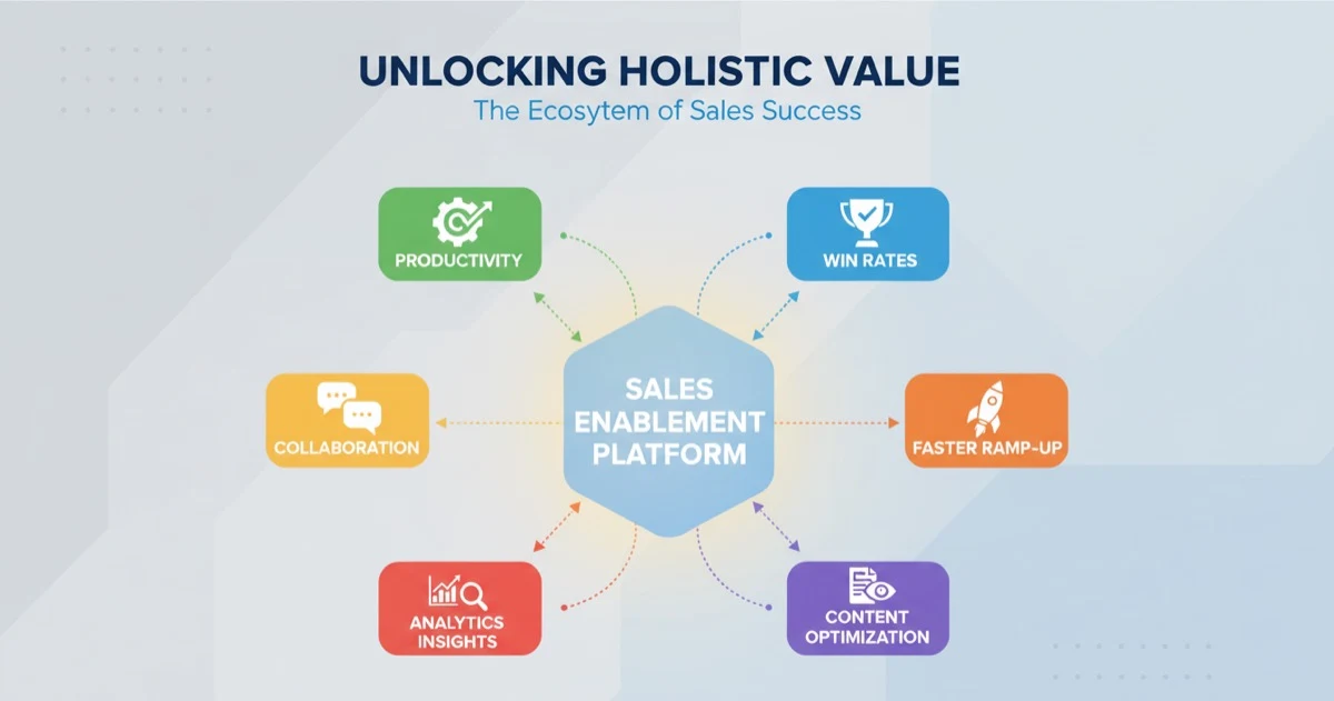 Many stakeholders believe sales enablement software's ROI only comes from a direct, immediate bump in sales revenue. While increased revenue is a primary goal, this view is too narrow. The software also impacts efficiency, rep productivity, content effectiveness, and sales cycle duration, all of which indirectly contribute to revenue and cost savings.